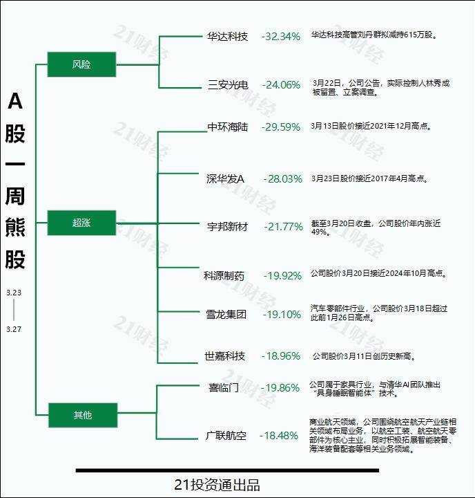 本期熊股榜中,华达科技(603358.SH)过去一周累计跌超32%,成为最熊股。此外,中环海陆(301040.SZ)单周跌超29%,深华发A(000020.SZ)累计跌超28%,紧跟其后。三安光电(600703.SH)、宇邦新材(301266.SZ)等熊股单周跌幅也均在20%以上。