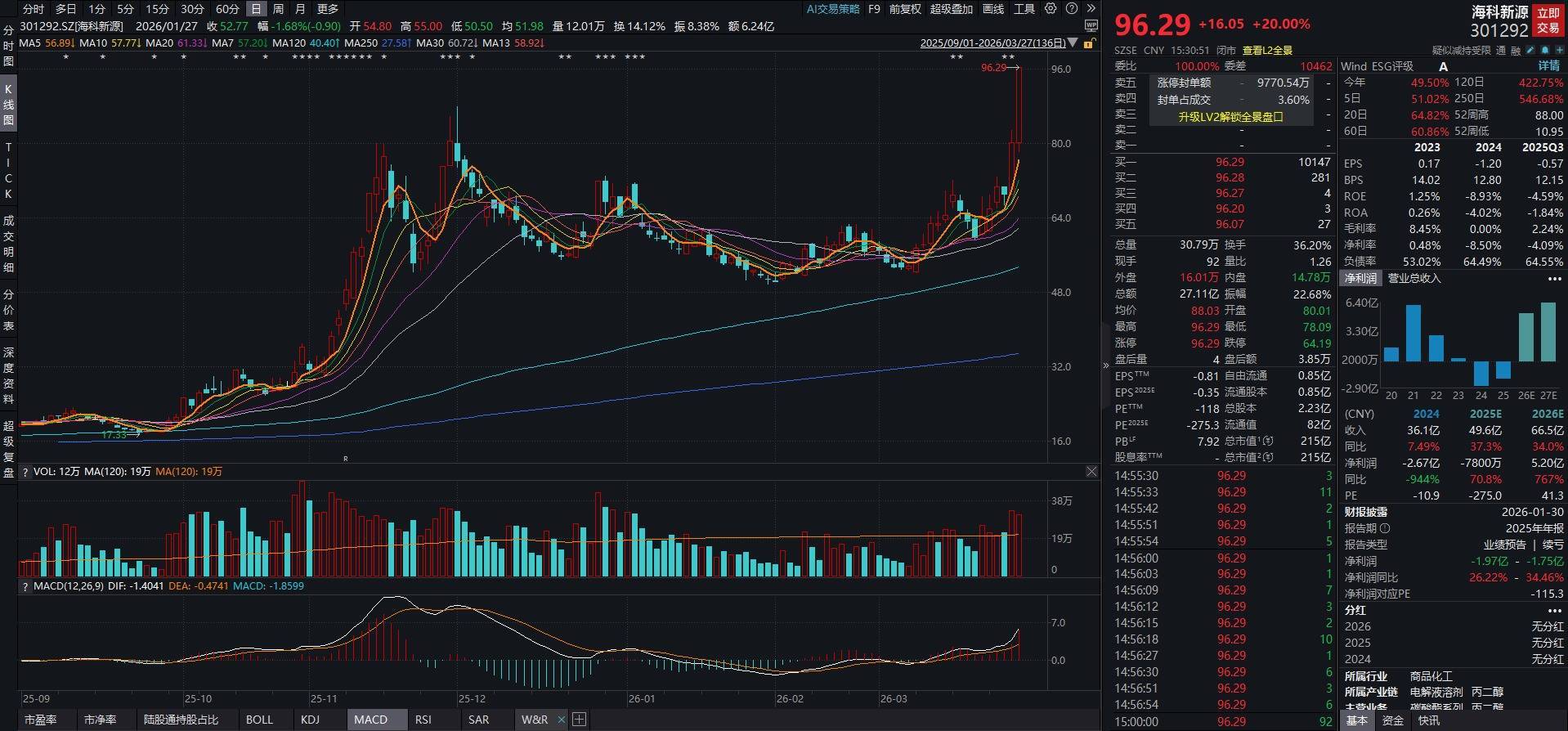 二级市场上,3月27日,海科新源20CM涨停,股价创历史新高,此前一日(3月26日)大涨超16%,过去一周五个交易日累计涨幅超51%。