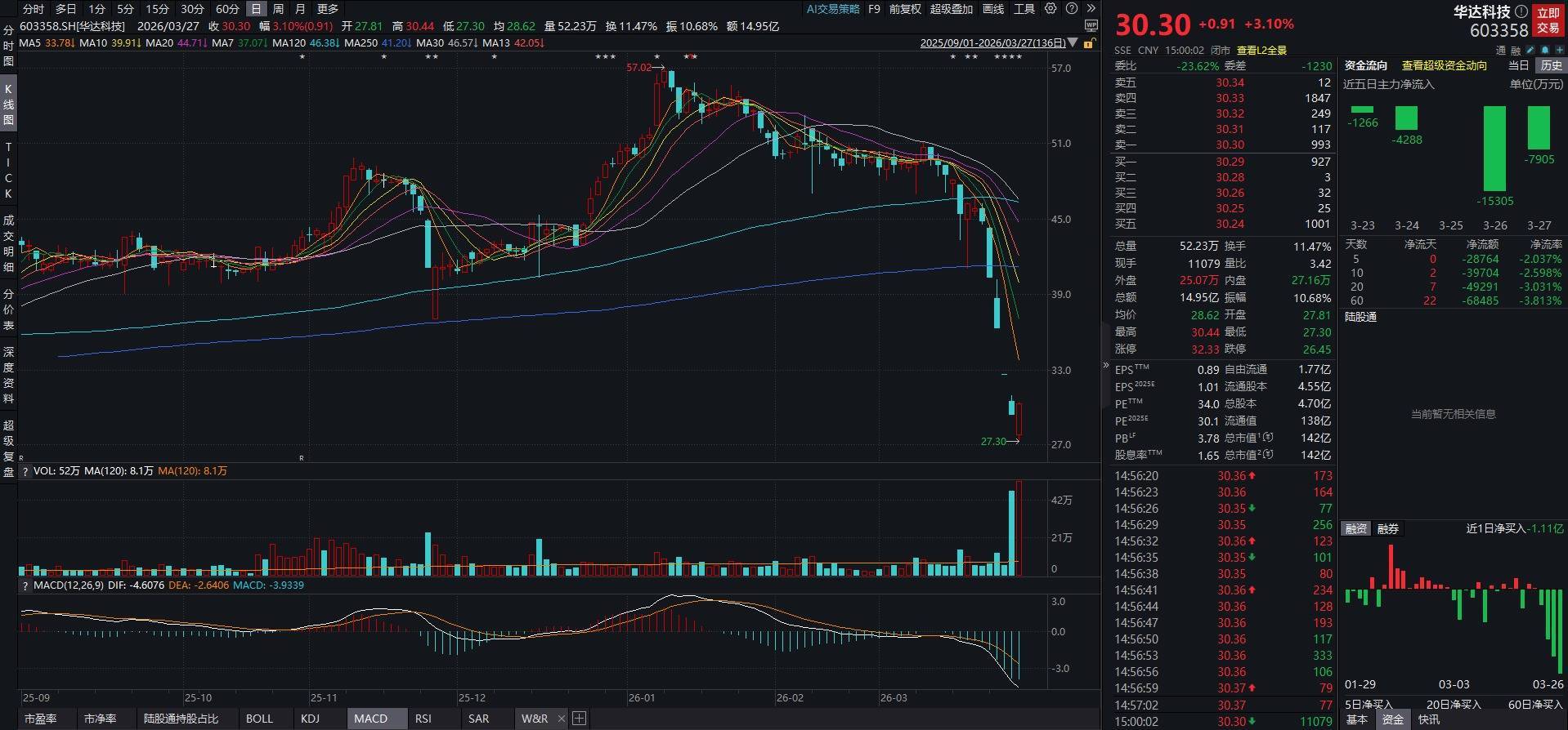 从二级市场表现来看,过去一周五个交易日中,华达科技自3月23日至25日连续3个交易日走出跌停板,3月26日逼近跌停,3月27股价探底回升截至收盘拉涨超3%,最新股价为30.30元,市值142亿元。