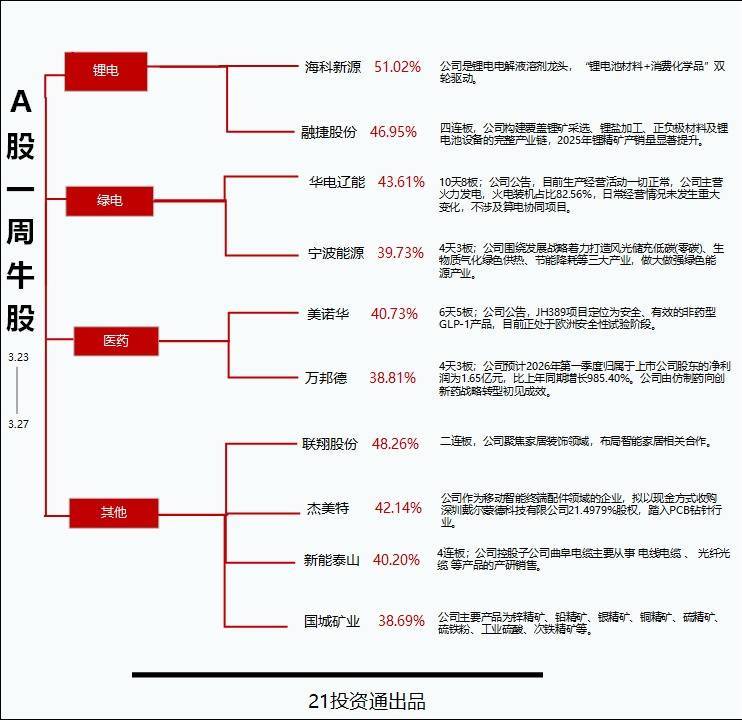 锂电产业链活跃,最牛股海科新源股价创历史新高本期牛股榜中(剔除近一月上市的次新股,下同),多只锂电、绿电概念股涨幅领先。其中,海科新源(301292.SZ)单周大涨超51%,股价创历史新高,成为本期的最牛股。联翔股份(603272.SH)过去一周涨超48%,排名第二。此外,融捷股份(002192.SZ)、华电辽能(600396.SH)、杰美特(300868.SZ)等多只牛股涨幅均在40%以上。